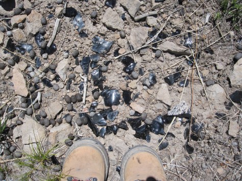 For thousands of years, prehistoric miners knocked down big  cobbles of obsidian into pieces more easily carried to distant pueblos, where they would be knapped into knives, scrapers, projectile points. What is left is debitage; whole acres of mesa glitter with a pavement of black glass.