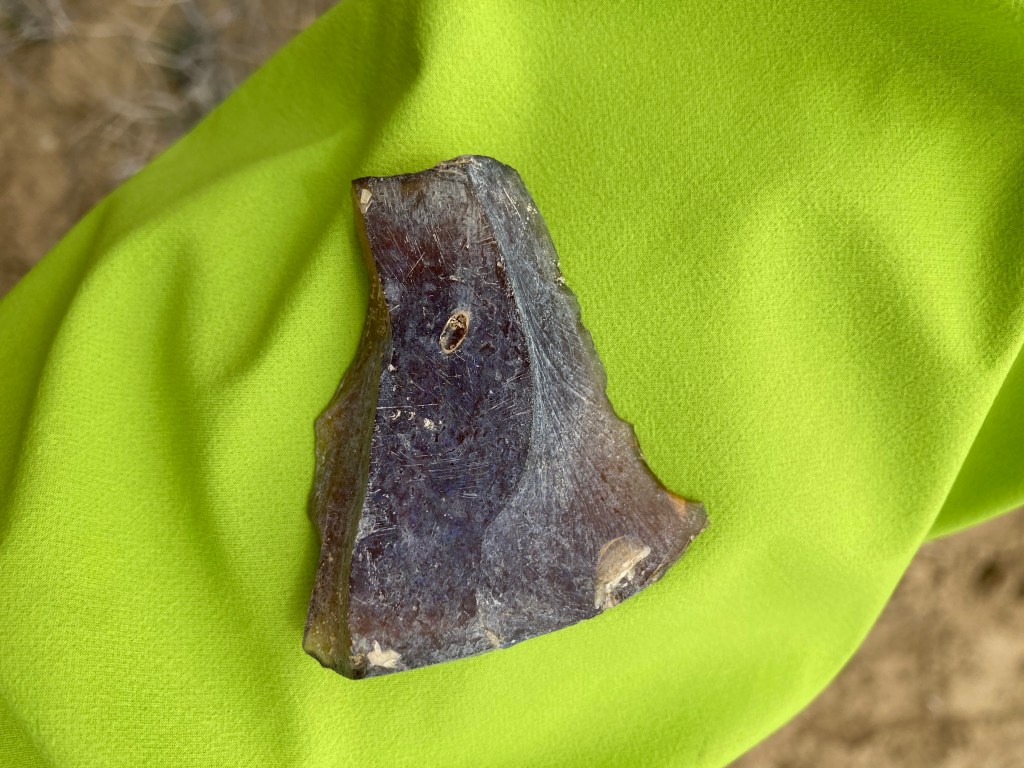 A chunk of thick, nineteenth-century beer bottle repurposed–right edge retouched–as if it were a flint flake.
