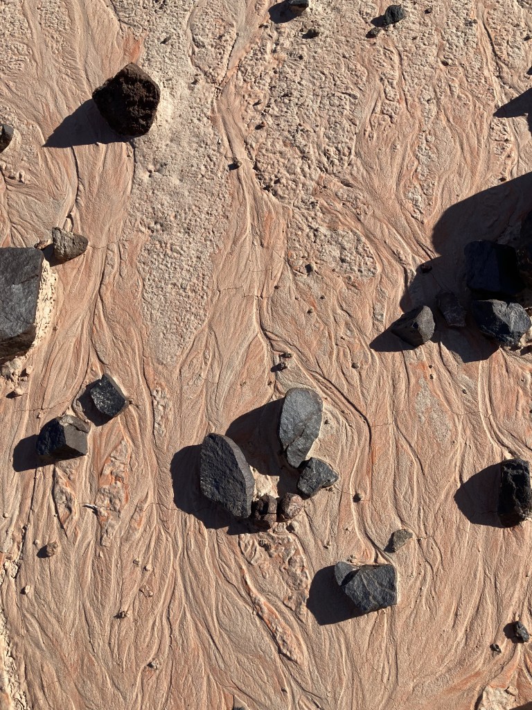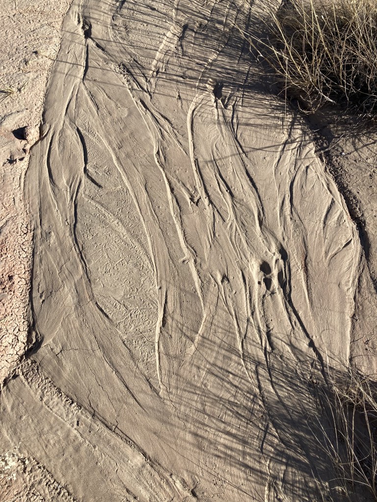 Cascading down the side of an arroyo, the mortal (and purple) remains of a Mesozoic beast. The faintly purple tinge of the bone fragments may be due to manganese, says a local paleontologist who refuses to stake his life on that.