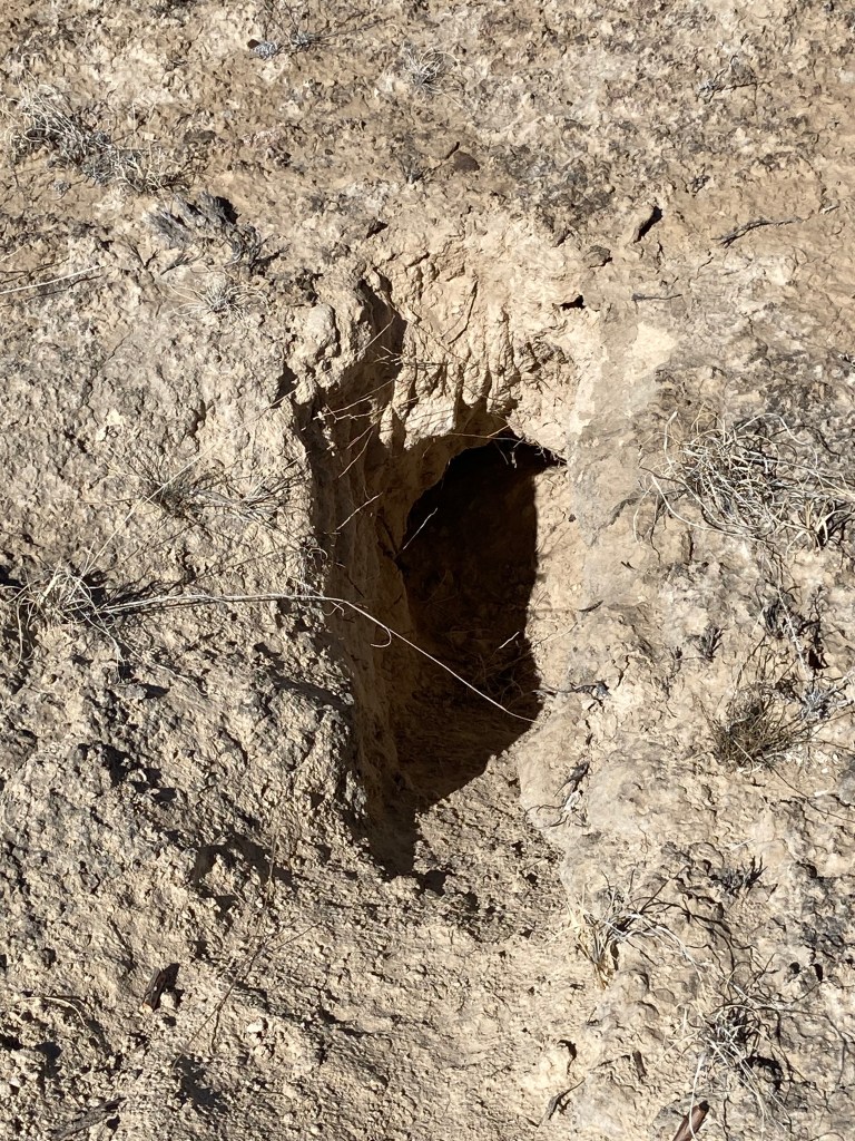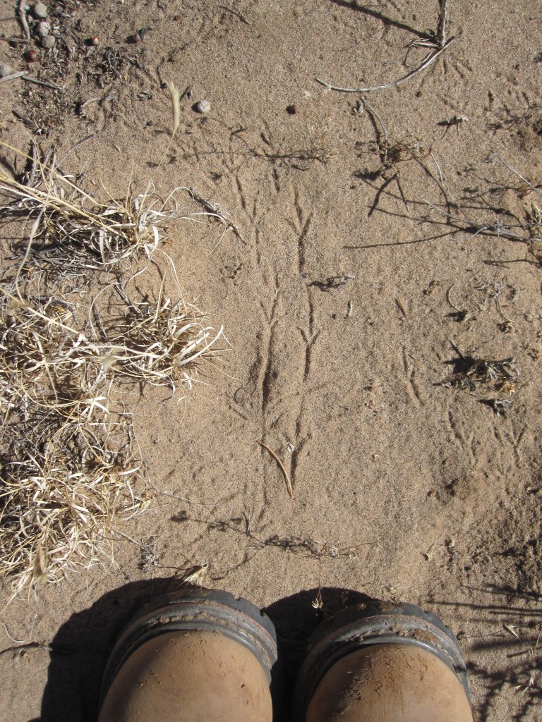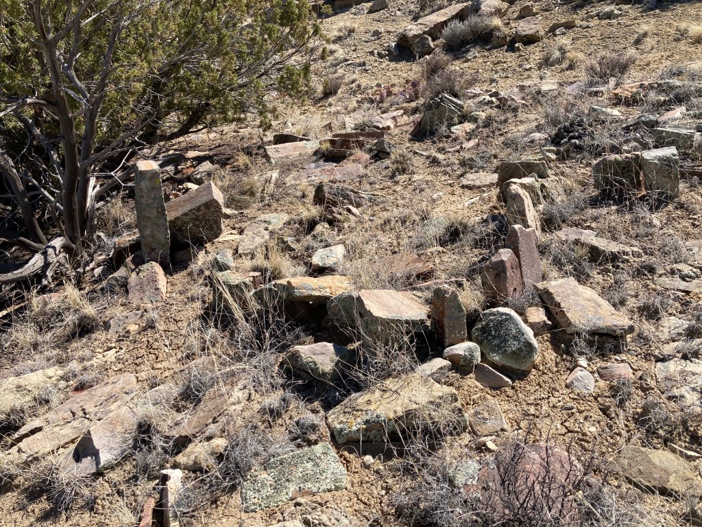 The square-cornered foundation and a couple of scattered sherds say Ancestral Pueblo, but both the vertical orientation and the size of the stones are unusual and impressive. Walls and roof–jacal style, the Southwest version of wattle-and-daub–have long since dissolved into the desert clay.