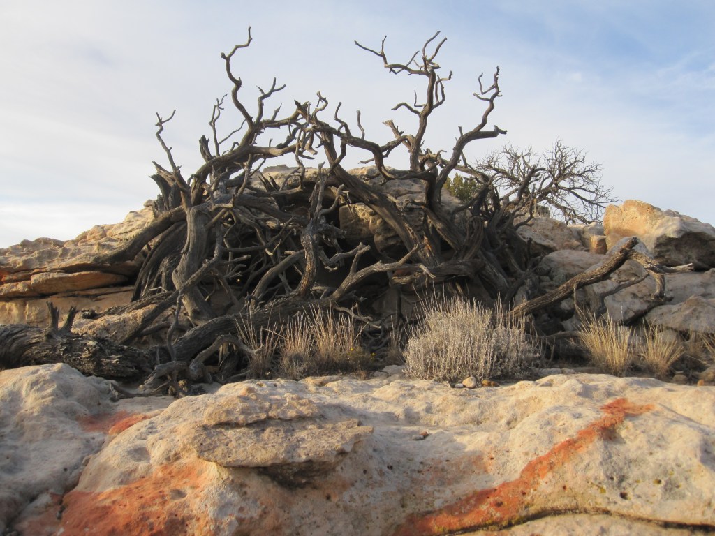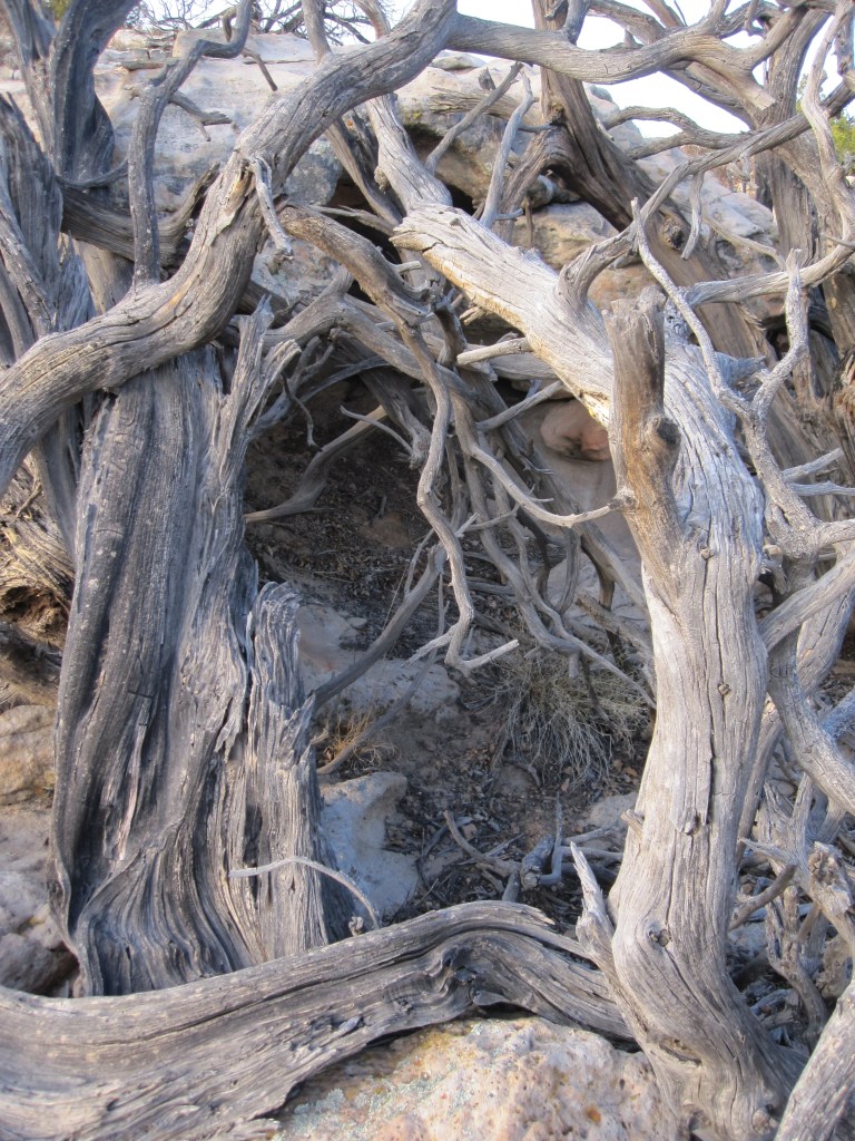 A little rock shelter in the sandstone where—maybe in the early 1900s judging from the state of the juniper—a Navajo sheepherder, a woodcutter, or an outlaw had augmented a natural cave with cut branches.