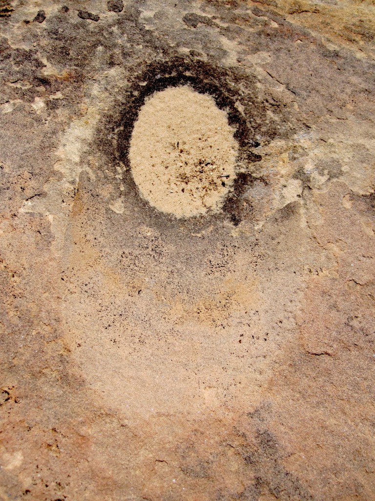 On raindrop-pecked sand, the subtle lunar crescent of an Archaic metate broken and abandoned a few thousand years ago.