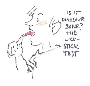 Found a large dinosaur bone on the ridge by following its fragments up a wash. It was falling apart; we dug some of the sand away from it, then covered it back up without ever having located both ends. Jan taught us the lick-stick test: If it’s bone, rather than another type of rock like agate or petrified wood, it will stick to your tongue when you lick it. (The porous vesicles left by cells and capillaries wick up the moisture of your tongue.)
