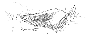 On a hillside of small-grain, gray, dissolving shale we came upon a slab of white sandstone, set on end like a tombstone and blocked up all around with dark rocks. Prickly pear had grown in among the stones.
