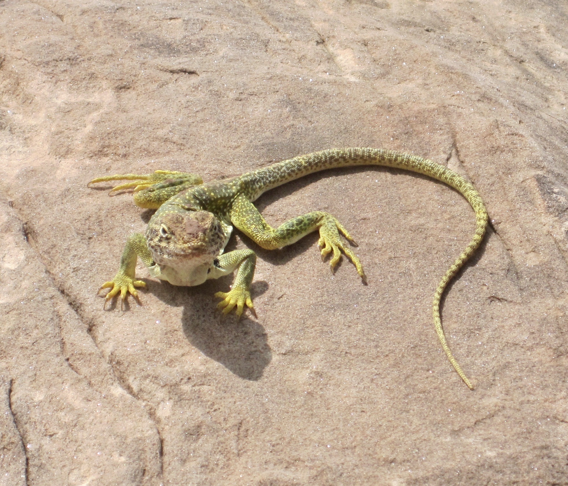 The sinuous watercourses are full of red mud. This collared lizard—male? female?—out and about before cold weather, was actually an outrageous neon chartreuse. With a muddy face.