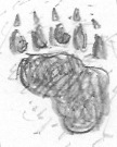 A bear’s footprints, round sole, four fat round toes. We followed them; the bear had broken branches from a juniper to eat the ripe berries. Suddenly Jan said, “There!”