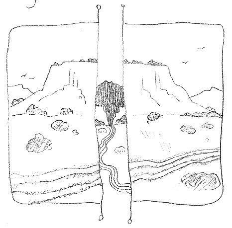 From the western ridge of the syncline a pass looks out over Cabezón, shadowy and shadow-washed. Many ancient, rudimentary stone circles scatter their boulders on high points. Each may be the site of a vision quest; we can think of no other explanation. Below lie mineral springs. One is raised on its deposits, a breast whose nipple is a pool, perfectly round, green as an old penny.