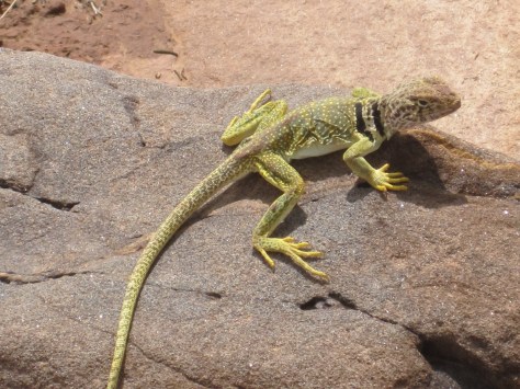 The sinuous watercourses are full of red mud. This collared lizard—male? female?—out and about before cold weather, was actually an outrageous neon chartreuse. With a muddy face.