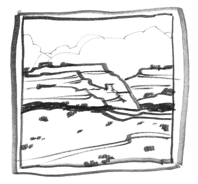 The windward side had that gappy wall, though a sketchy barrier had been built on the open leeward side. Had the floor been built up with imported sand? Had those sawn posts, now fallen, held up a tarp of some sort? What looked like a bed of green juniper was a pack rat nest; the floor was thick with droppings. Among them were bits of rusty iron: a bolt, a rod, a strap from the leaf spring of a buggy or an early auto. What had once been in that metal frame? In the “forecourt” was a rusty bucket.